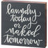 A wooden block sign features a hand lettered "Laundry Today Or Naked Tomorrow" sentiment on a gray base with dark stained sides for added interest. Our Laundry Today Or Naked Tomorrow block sign easily hangs via predrilled keyhole slot or can free-stand alone.