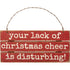 Rustic style meet simple Christmas charm with this slat wood hanging décor piece, featuring a distressed "Your Lack Of Christmas Cheer Is Disturbing!" sentiment in an understated palette.
