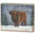 A wooden block sign displaying a charming winter scene of a highland cow wearing a Christmas wreath. Holiday cow design is replicated from original artwork painted onto burlap canvas, giving the art a unique depth and texture. Seasonal block sign features distressed details with coordinating green color on the sides and back. Our Snowy Highland sign is easy to hang via predrilled keyhole slot or can free-stand alone. A rustic seasonal home accent that can be easily displayed in any home or work space.
