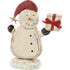 A wooden sitter displaying a happy snowman holding a present recreated from original hand carved and painted pieces with distressed details. Sitter features ribbon and glitter accents to create a handmade feel. Our Snowman Gift chunky sitter is designed to free-stand alone on flat surface. A fun seasonal home accent that adds character to any display.