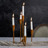 A metal candle holder features a candelabra design that can free-stand on flat surface with five metal slots that fits standard tapered candles. Candles not included. Our Candelabra candle holder is perfect for a rustic home accent.